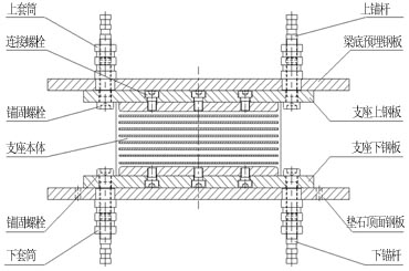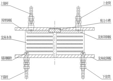 Ⅱ型——支座與墩、梁之間采用套筒連接,支座底面不設(shè)預(yù)埋鋼板,底鋼板和套筒之間采用錨固螺栓連接,上預(yù)埋板與頂鋼板之間采用卡榫連接,上預(yù)埋鋼板與套筒之間采用配合焊接。