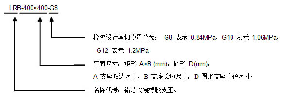 例一:J4Q1320×1320×223G1.2表示4根鉛芯的矩形支座.其長(zhǎng)度A=1320(mm),寬度B=1320(mm),高度h=223(mm),剪切模量G=1.2MPa的鉛芯隔震橡膠支座。